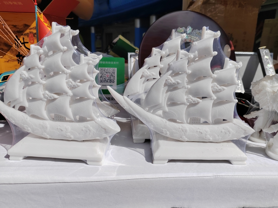 展位上,一种的盐雕工艺品引起了许多人的好奇。泉州有数百年的产盐历史,洁白的盐雕不仅可以做出郑和福船、簪花女等各种特色造型,更可以在制作过程中加入艾草、香茅、薄荷等中草药成分,摆放在家中,既是工艺品,也有清热解毒、驱逐蚊虫、提神醒脑等功效。