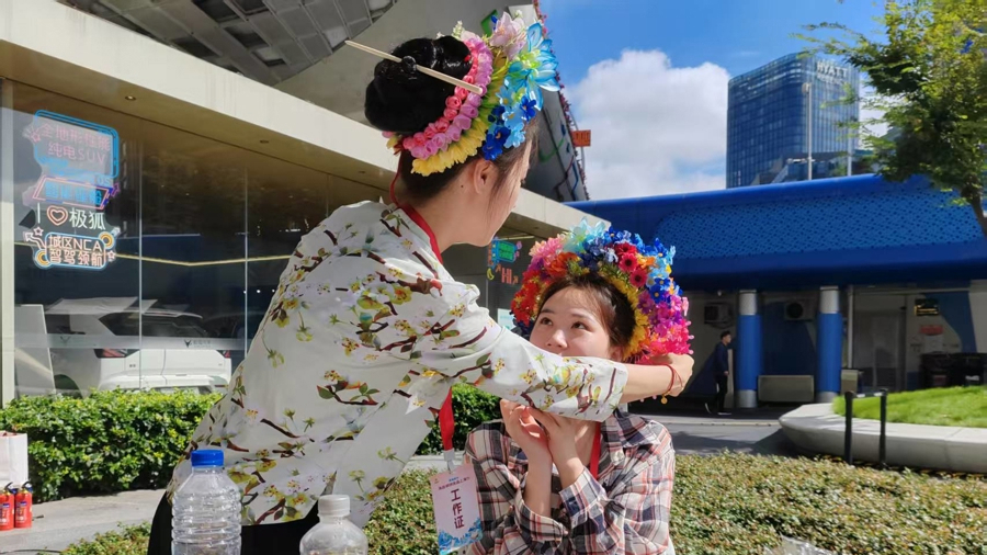 活动开幕式充满了浓郁的闽南风情,祥狮献瑞的锣鼓声铿锵震天,悠扬的南音旋律缓缓流淌,灵活灵现的木偶表演引得市民频频拍手,独具特色的惠女风情表演更让手机镜头纷纷聚焦。在极具蟳埔特色的簪花体验区,各种年龄的女性市民排队打卡,待绚丽花饰别在发间后,更要拿起手机,美美地拍上几张照片,记录下自己与闽南文化的亲密接触。